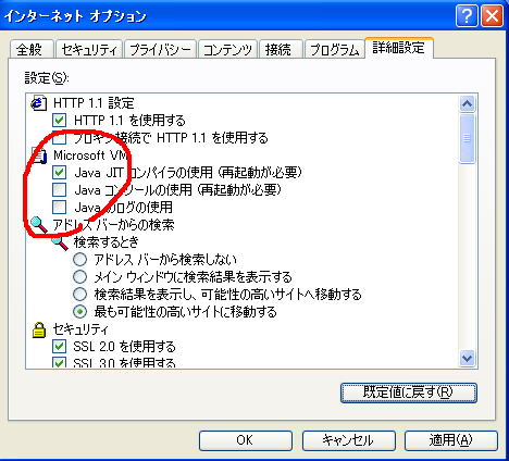 | 宝彩有菜のe-講座では、 パスワードの判定は、ジャバというプログラムを使用して行っております。 そこで、ジャバの設定が合っていないと、上手くいきません。 ジャバの設定が正しいかどうか、ご確認ください。 (確かめ方) インタネットエクスプロラーの「ツール」をクリックして「インターネットオプション」を開きます。 「詳細設定」の中に、Javaの項目がありますので、その設定が次のようになっているか確認してください。 もし、そうでなければ、下記のように変更してください。 javaの項目に1つ、チェックが入っていれば、 javaが使えますので、そのように設定してみてください。 (既定に戻すと、たぶん、そうなります。) |