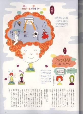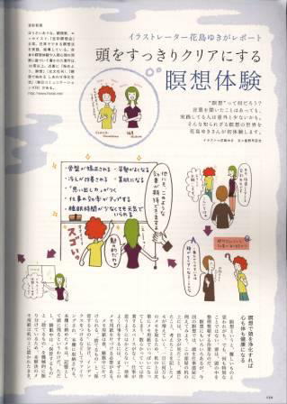 「瞑想で始めるしあわせ浄化生活」を もとにして、「自然力ケア」(2008/10)(定価933円)に、取材記事が 掲載されました。 イラストレーターの花島ゆきさんが、体験レポートされています。 文章は、星野早百合さん。 瞑想とはなにか? とても簡潔によくまとめてレポートされていますので、 ご紹介します。 宝彩有菜 |
